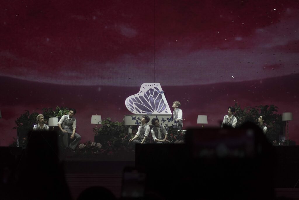 Um 19:30 Uhr war es dann soweit: ENHYPEN betraten die Bühne. Und sie legten direkt mit energiegeladenen Choreografien und eindrucksvollen Bühnenbildern los. Jede Performance bot ein neues, detailreiches Set, welches die Fans in die Welt der Gruppe eintauchen ließ. Besonders in Erinnerung blieben Auftritte wie „Lucifer“ von Jay, Jake und Sunghoon oder „XO (Only If You Say Yes)“, bei welchem Heeseung an einem Flügel in Schmetterlingsmuster die ersten Töne spielte – ein Moment, der das Publikum sprachlos machte.